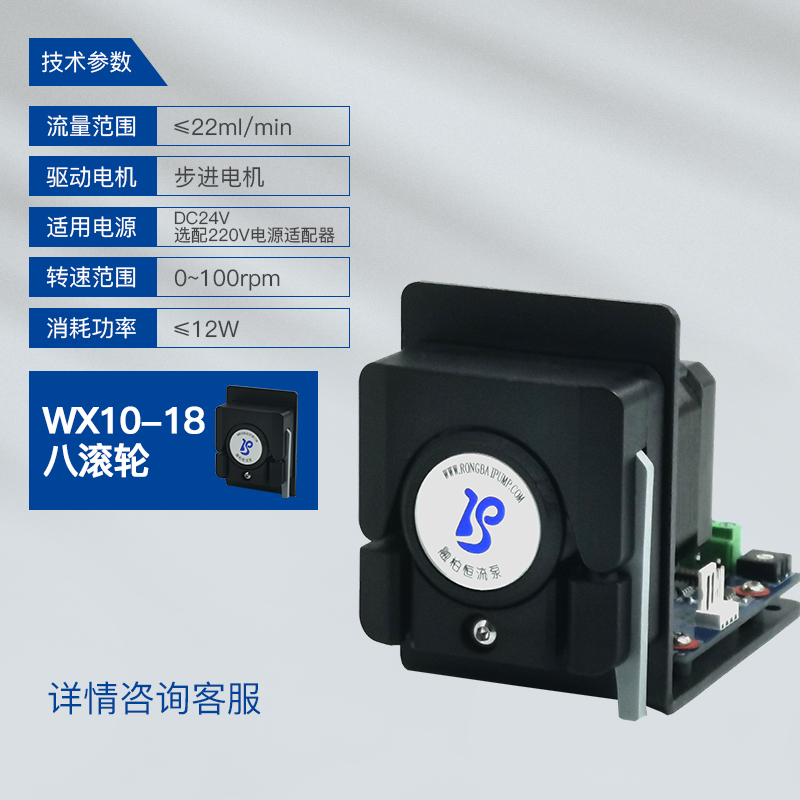 適用泵頭:WX10-18(8滾輪),適用軟管:壁厚0.8mm,內徑≤3.17mm,流量范圍:0.035 - 22(ml/min),通道數1
