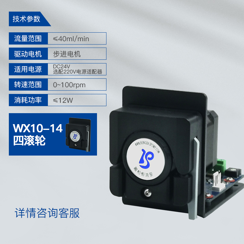 適用泵頭:WX10-14(4滾輪),適用軟管:壁厚0.8mm,內徑≤3.17mm,流量范圍:0.05 - 40(ml/min),通道數1
